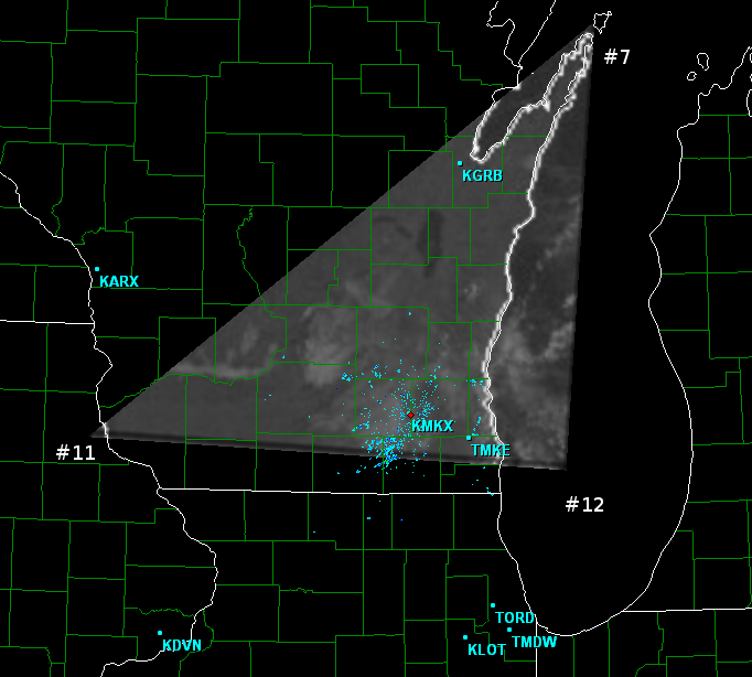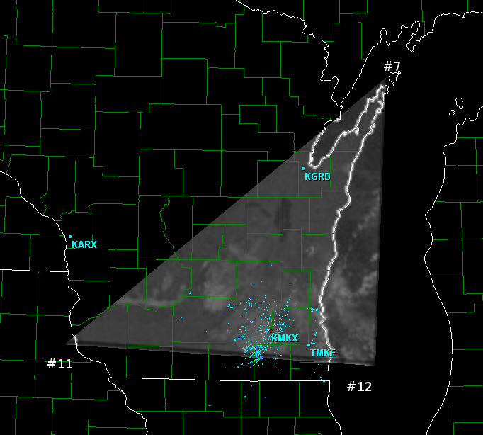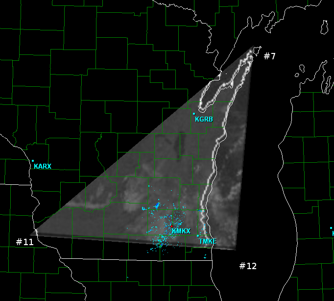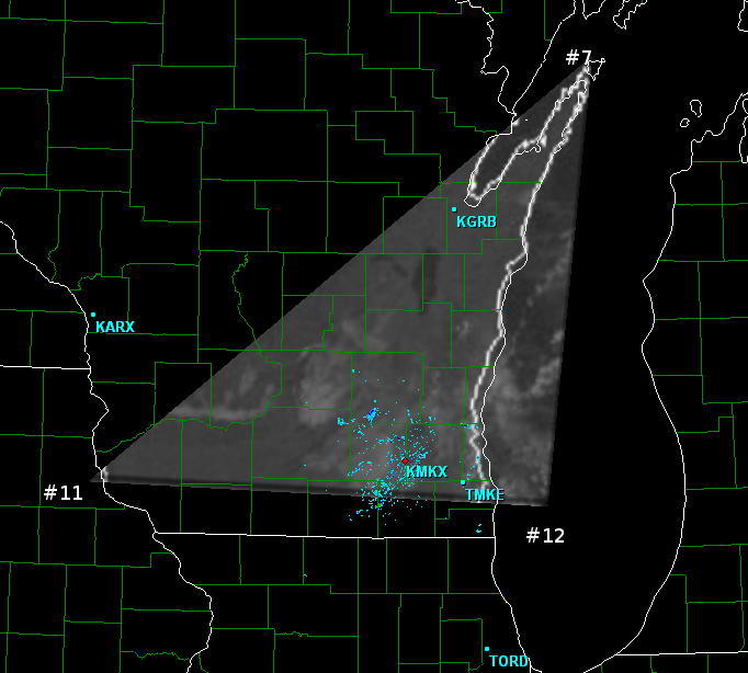 Open up GRL3 and go to a radar site that has this triangle in view, such as Milwaukee. Place your mouse pointer as close to the point 7 as you can eyeball on GRL3. It should be just to the left of where the land in Wisconsin NE of Green Bay ends. Since a screen capture doesn't show the mouse pointer, I put a red dot next to where my mouse was. In the lower right of the GRL3 window, it will show the lat/lon coordinates of this point. So tentavitely, point 7 has a lattitude/longitude coordinate pair of 45.45 and -86.91. There is no need to go beyond a hundreth of a decimal.